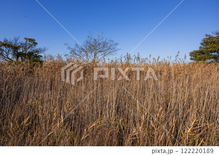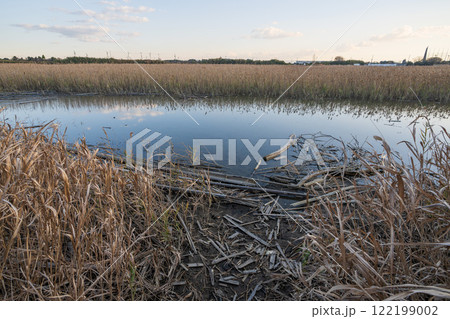 枯れた葦原の中の野鳥のサンクチュアリ 浸透実験池跡