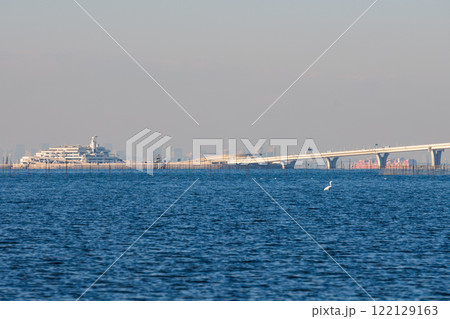 盤洲干潟から見た海ほたる 浅瀬ではダイサギが羽を休める