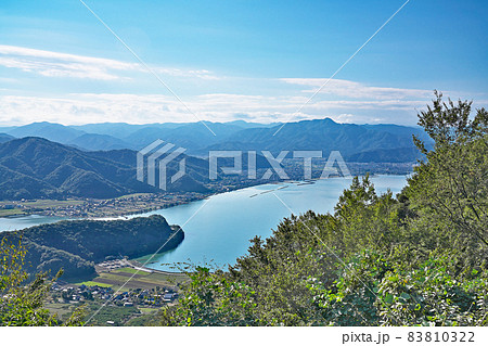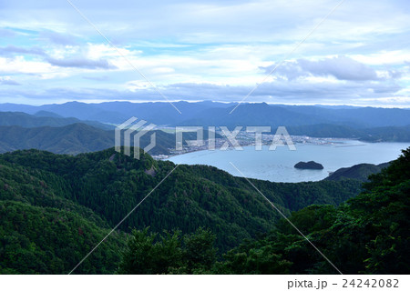 エンゼルラインから見た小浜湾と小浜市内とその向こうに見える山々のある風景