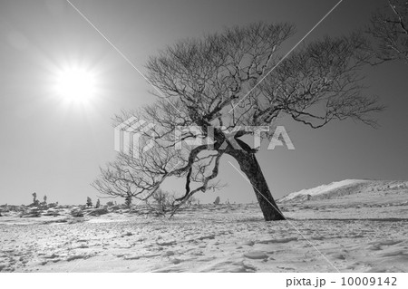 冬の道東 夕日をバックにした藻琴山の木のシルエット(北海道)