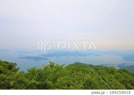 広島県三原市の竜王山から瀬戸内海の島々と行き交う船舶を眺める春夏梅雨の曇りの日