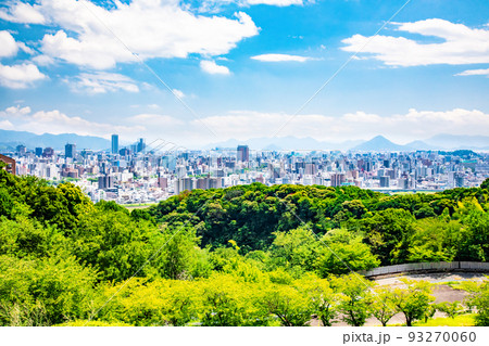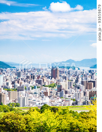 広島市西部の高台(竜王公園)付近から、広島市の南東方面を展望しています。瀬戸内海が見えます。
