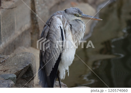 公園の池のほとりで休息をとるアオサギー拾