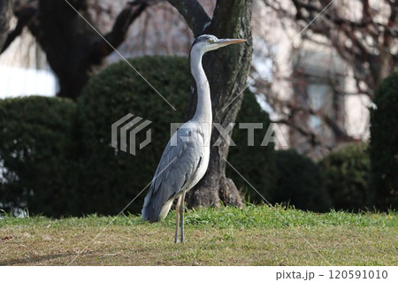 突然公園に舞い降りた凛々しいアオサギの姿