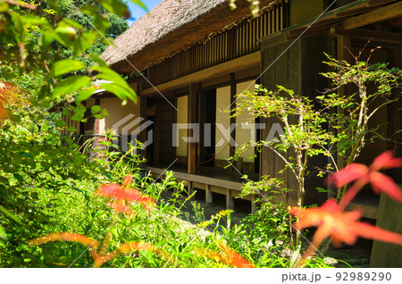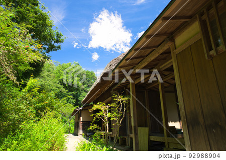 古民家の庭先 茅葺屋根の日本家屋 小谷戸の里