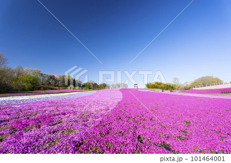 早朝の市貝町芝ざくら公園 青空と満開のシバザクラ 栃木県市貝町
