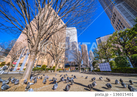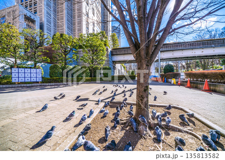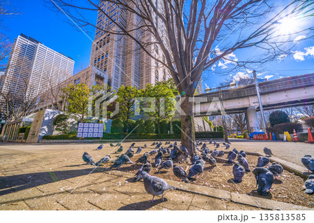日本の東京都市景観 都庁前駅…日光浴をするハトの群れ…人が通っても逃げない…=令和8年1月25日