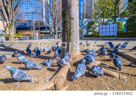 日本の東京都市景観 都庁前駅…日光浴をするハトの群れ…土のほうが暖かいのかな…=令和8年1月25日