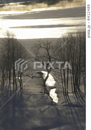 水面に映る木々と氷上の樹影