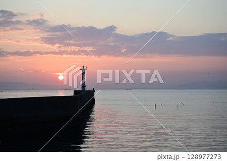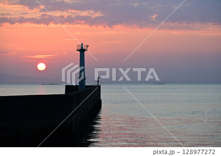 海に昇る朝日と釣り人