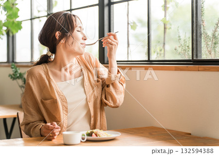 カフェでランチにパスタを食べている若いアジア人女性