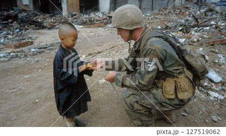 米兵からお菓子をもらい微笑む日本の少年、戦後の焼け跡で