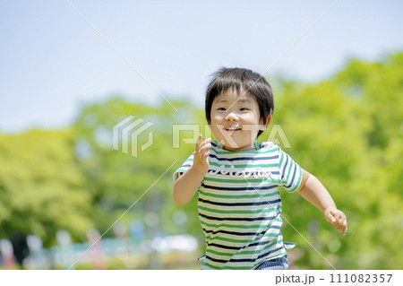 新緑の公園を走る男の子