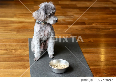 ふやかしたドッグフードと老犬のトイプードル 食事の前に待てをしている様子