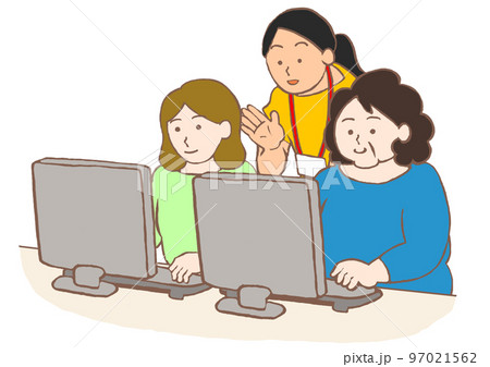 優しいタッチのパソコン教室の先生と生徒イラスト(わきあいあい)