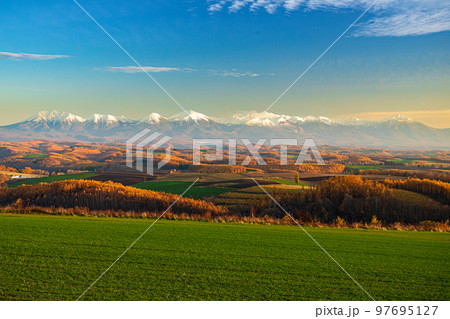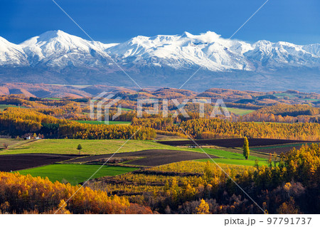 晩秋の美瑛の丘と新雪の十勝岳連峰