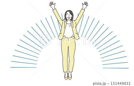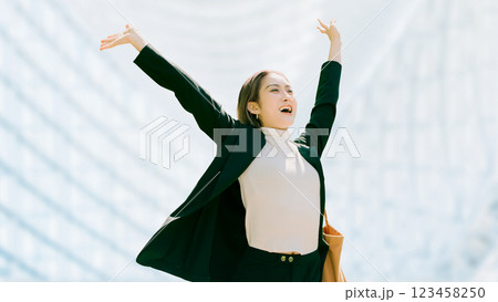 両手を広げて喜ぶ笑顔の女性・ビジネスウーマン