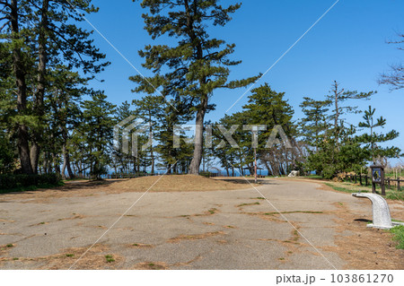 晴れの尼御前岬の公園に育つ大きな松|石川県加賀市