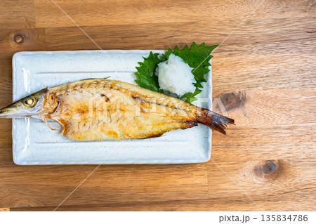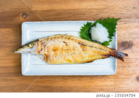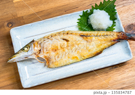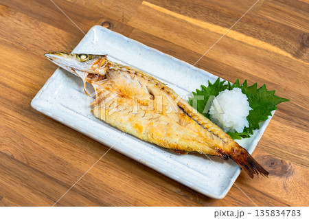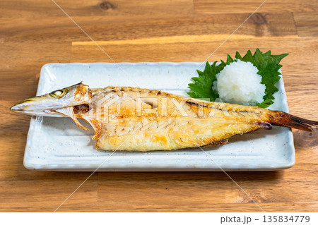 カマスの塩焼き 大根おろしと大葉を添えた和食の焼き魚