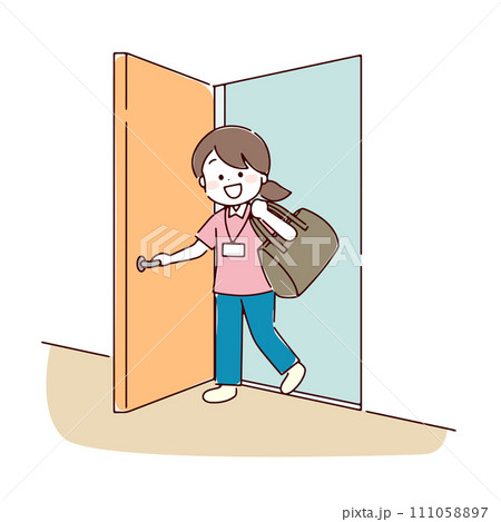 笑顔で訪問先の部屋へ入る訪問看護師 線画