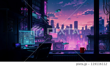朝焼けに照らされたサイバーパンクシティが見える仕事部屋。