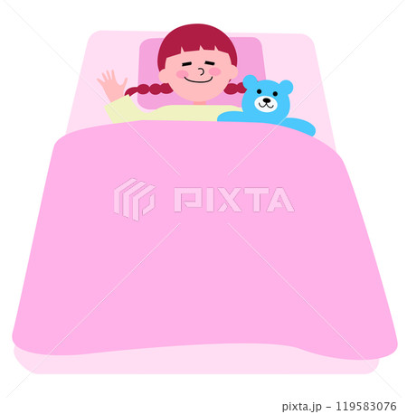 布団をかぶって幸せそうにクマのぬいぐるみと寝る幼い女の子のイラスト