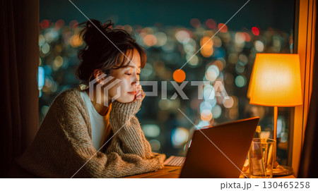 夜景を背景に自宅の窓際でノートパソコン作業をする女性、暖色照明のリラックスした室内ムード