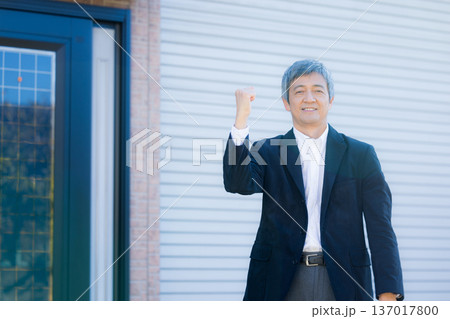 社屋建物の前で考える60代男性