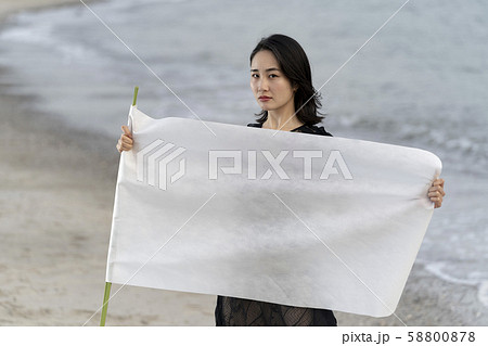 闘いに挑む目力の強い白布を持ち波打ち際に仁王立ちする女性コピースペース