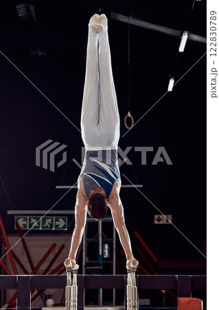 Strong man training for fitness in gym, cardio sports exercise at stadium at night and sport workout for health and wellness in dark arena. Young athlete person doing gymnastics in competition