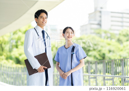 公園・屋外にいる医療スタッフ(医師・看護師・医療従事者・大学病院)