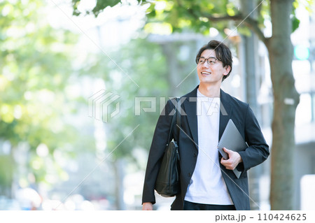 街を歩く紺ブレスタイルの30代日本人ビジネスウーマン