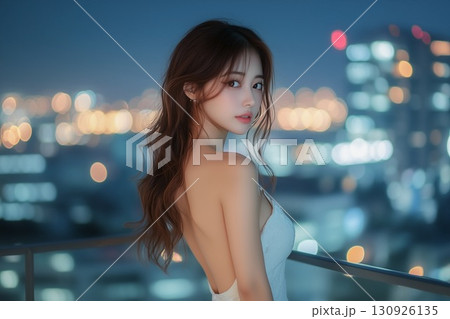 夜景を背景に白色のセクシーなドレスを着た若い女性