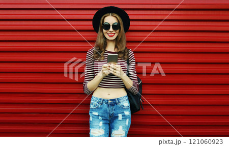 Portrait of stylish young woman with smartphone on a red background