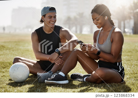 Phone, fitness and soccer friends on field check training results app, watch mobile goal or social network football update. Sports, athlete or exercise couple on 5g smartphone for outdoor health chat