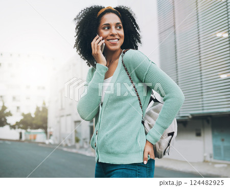 Backpack, phone call and student in city street walking to university, listening to results or feedback on internship opportunity. Happy black woman with smartphone call talking outdoor in urban road