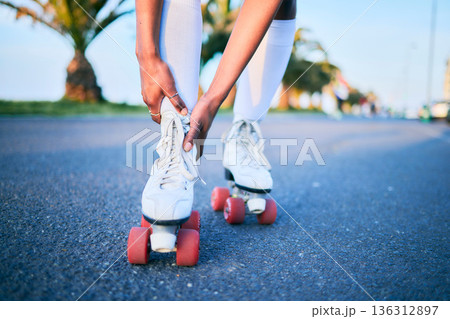 Leg injury, roller skates and hands on street for exercise accident, workout or training mockup. Skating, shoes of person and pain on road, arthritis or medical emergency, fibromyalgia and hurt ankle