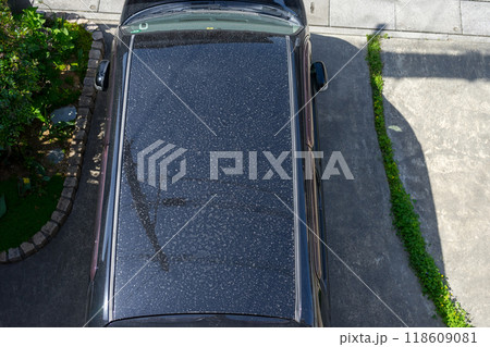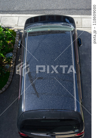 一戸建ての駐車場に停められたクルマのルーフの汚れを俯瞰撮影したイメージ