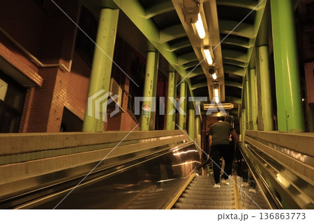香港の長いエスカレーター 夜の街をつなぐ上りエスカレーター