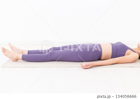 ヨガスタジオでヨガをする女性・シャバアーサナ