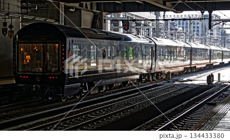 博多駅を発車するJR九州のクルーズトレイン「ななつ星in九州」最後尾