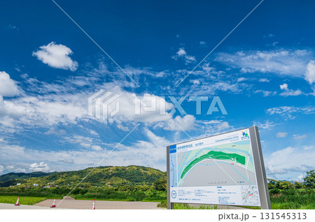 (看板・案内板)初夏の青空を背景に映える新緑風景(菊池市・菊池公園)