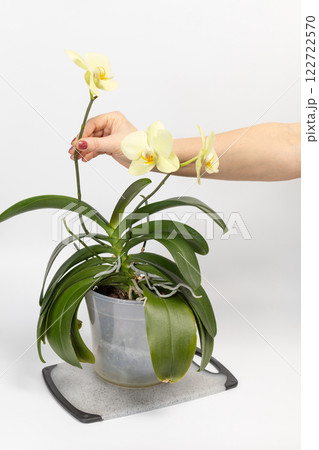 Woman's hand holding a branch of Phalaenopsis orchid flower on the white background.
