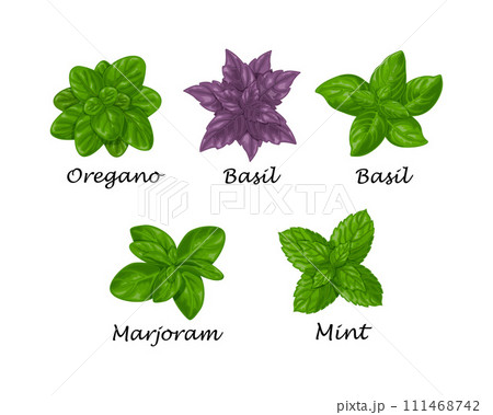 Spicy herbs. Basil, oregano and marjoram. A network of fresh herbs. Seasonings for cooking. A collection of spices. Vector illustration