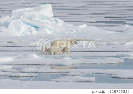 Wild polar bear (Ursus maritimus) mother and cub on the pack ice