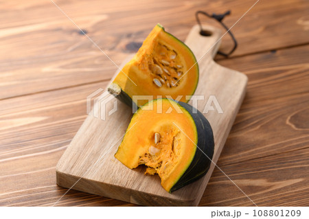 まな板の上でカットしたかぼちゃ 木目背景