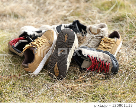 芝生の上に集めたたくさんの運動靴