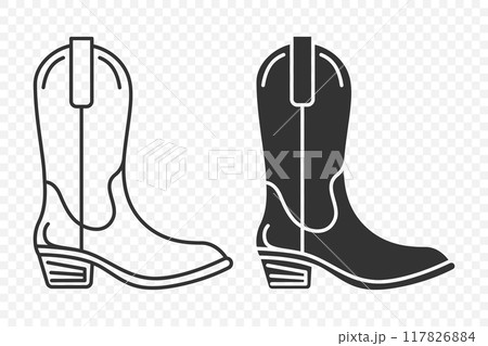 Cowboy Boots. Flat Vector Linear and Silhouette Male and Female High Boots Icon Set Isolated. Footwear Symbol Set, Design Template, Clipart. Vector Illustration