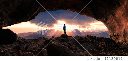 Adventurous Man Hiker standing in a cave. Mountains in background. Adventure Composite 3d Rendering