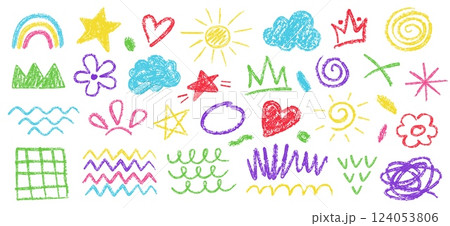 Kids crayon drawings. Hand drawn scrawls, chalk sun doodle, rainbow sketch, scribble star shape, scrawl heart and pastel cloud drawing. Simple child art vector set